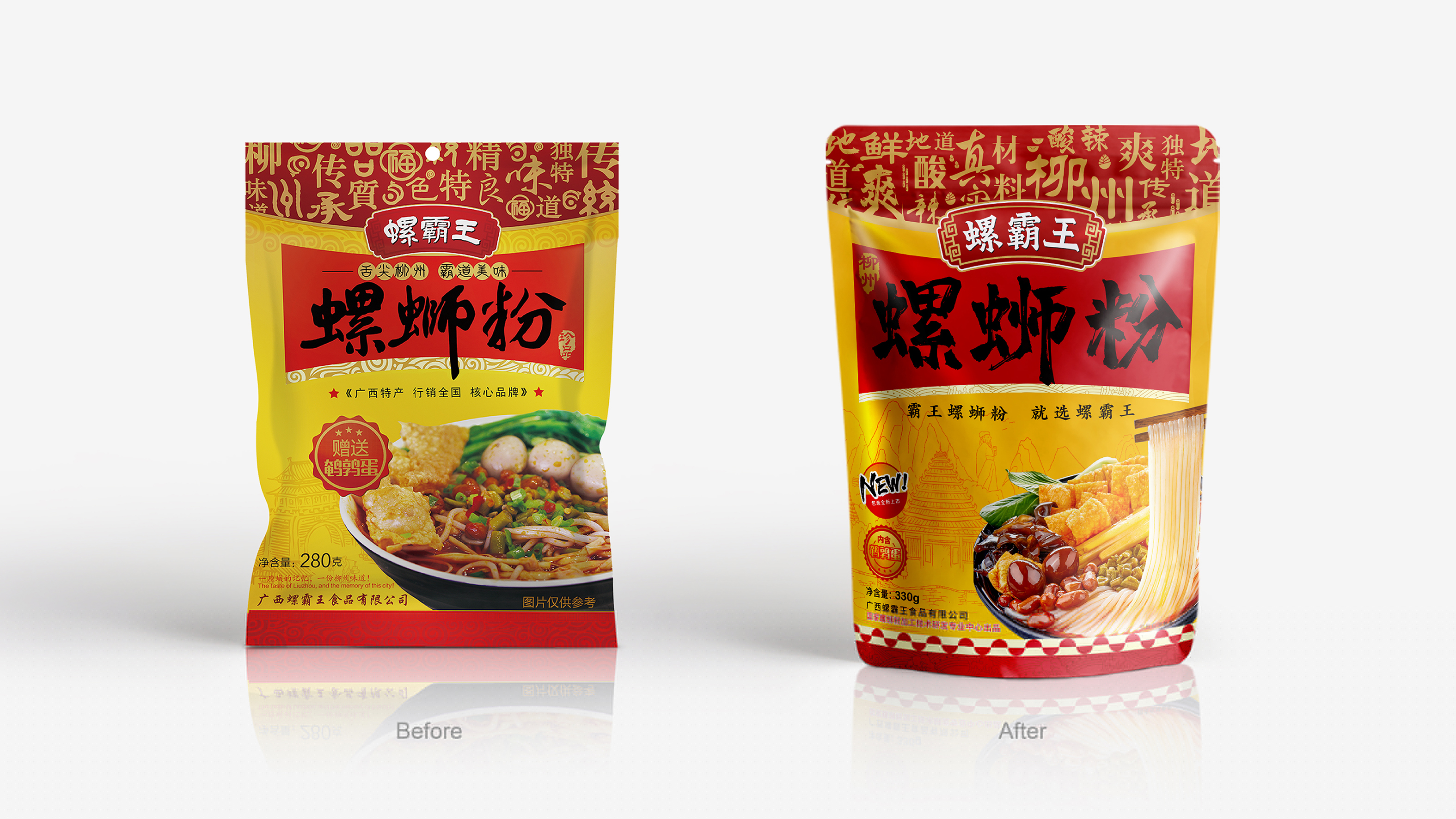 從“柳州地域”與“中國第一”的角度審視,我們認為,紅黃色之于螺霸王是非常有價值的,它不止于傳承品牌識別功能,更多的是柳州龍城“黃”與中國霸王“紅”的霸氣印象加持。
